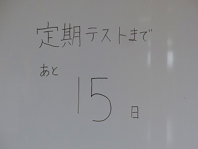 2年生の廊下に置いてあるホワイトボードに、第1回定期テストまでのカウントダウン表示がされていました。11日(火)は、定期テストまで、あと15日となります。テストは、6月26日(水)、27日(木)の2日間です。