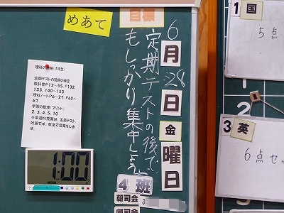 第1回目の定期テストが無事に終わりました。テスト明けの28日(金)の授業では、答案が返却されていた教科もあったようです。点数も気になったことと思いますが、間違っていたところの復習をして、次につなげてほしいと思います。今日の目標にも注目です。