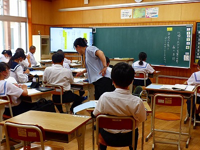 9日(火)の5校時、本校指導教諭(スーパーティーチャー)の先生による公開授業が行われました。1年生の国語の授業を他校の先生方が参観されました。来校された先生方から、「生徒が主体的に学んでいた。」、「先生と生徒の信頼関係が成り立っていた。」、「楽しそうな雰囲気が伝わってきた。」などの感想を寄せていただきました。画像からも、生徒たちの頑張っている様子が伝わってくると思います。この公開授業に向けて、日々の授業の充実に努め、貴重な授業を提供していただいた指導教諭の先生に感謝します。ありがとうございました。