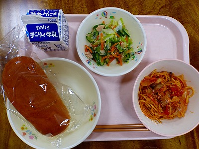 3連休明けの16日(火)は、先日までの猛暑ほどではありませんが、夏の日差しが降り注いでいます。そんな中、給食は「ひむかの日」ということで、県内産の素材が使われています。「トマトのスパゲティ」「小松菜のサラダ」「ミルクパン」がメニューとして出されました。きゅうり、小松菜、トマト、しめじは綾町産です。素材の旨さが出ていたメニュー、今日もおいしくいただきました。給食に関わっていただいているすべての皆様、ありがとうございました。