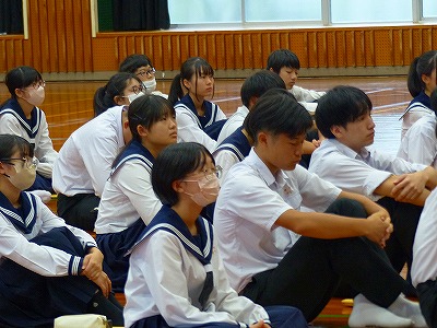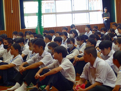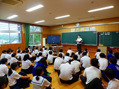 2日(水)の5校時、綾照葉樹林マラソン大会に向けての、事前学習会を行いました。大会実行委員の方々が来校されて、マラソン大会開催への思いを語られました。大会は10月27日(日)にありますが、この日は授業日となります。ランナーとして、応援者として、給水スポットの支援者として、生徒たちがそれぞれの役割で地域に貢献する日となります。どのような形で地域に貢献できるのかを、これから考えていくことになります。綾中学校全体で、地域の行事を盛り上げ成功に導いてくれるものと期待しています。実行委員の皆様、ありがとうございました。