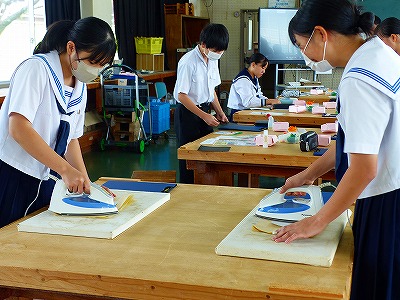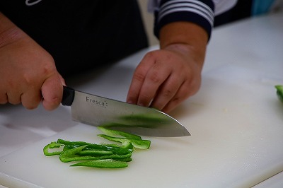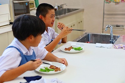 31日(木)の5・6校時に、1年生が調理実習をしました。豚肉のしょうが焼きと、ピーマンの炒め物です。なかなかの包丁さばきでピーマンを切っていました。豚肉を調味料に漬け込み、フライパンで焼きました。しょう油の焼ける匂いは食欲をそそります。匂いに誘われたのか、他の教室で授業をやっていた生徒たちが、休み時間に家庭科室に来ていました。後片付けもしっかりとした後、振り返りを行っていました。よい実習ができていたようです。