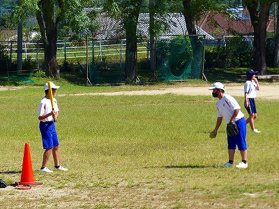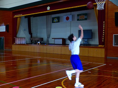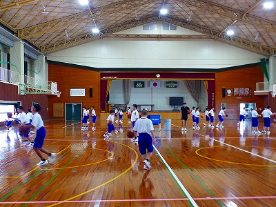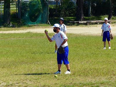 9日(水)の朝は、最低気温が20度を下回り、綾の町にも秋の気配が近づいてきました。長袖のシャツを着て登校する生徒の姿も増えてきました。そのような中、生徒たちは秋空の下、体育の授業に取り組んでいました。1年生の男子は、体育館の中でバスケットボールを、2年生はグラウンドでソフトボールをしていました。日中の暑さは、以前ほどではありませんが、まだ続いています。