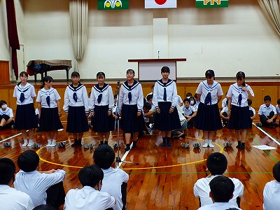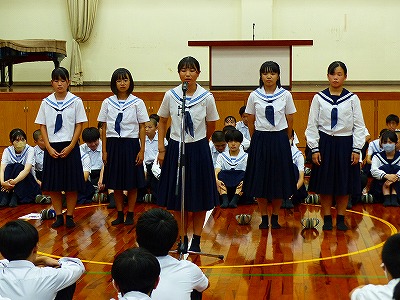10月がスタートしました。朝夕の涼しさは心地よいですが、日中はまだ30度を超える暑さが続いています。秋の深まりに期待したいところです。現在、各学年では、学習発表会(10月18日・金)のときの学年合唱発表に向けて、練習が本格的に始まっています。各教室から歌声が聞こえてくると秋を感じます。1年生の教室では、3つのパート分かれて練習に励んでいました。本番が楽しみです。