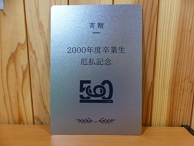 本校を、2000年(平成12年)に卒業された卒業生の皆様から、厄払いの記念として、生徒用整理棚を贈っていただきました。この棚は、なくてはならない物として毎日活用させていただいています。今後も大切に使わせていただきます。卒業生の皆様のご厚情に感謝申し上げます。ありがとうございました。