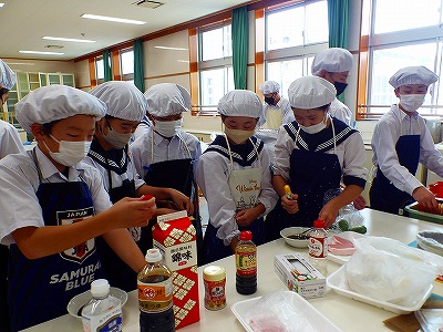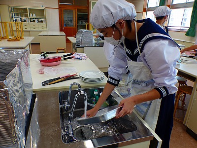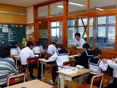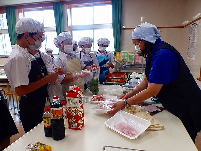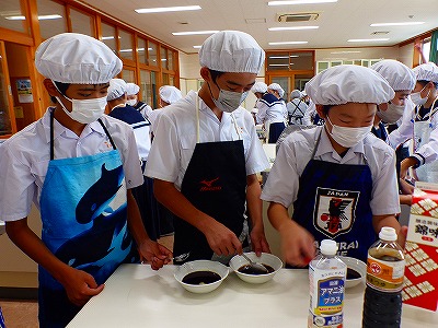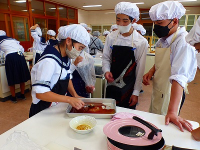 28日(木)の午後、1年生の学級で調理実習がありました。先日も、この話題については掲載しましたが、別の学級の様子です。今回も、日章学園高校調理科の先生や生徒さんに来校していただきました。生徒たちは先生方の説明を聞きながら、楽しそうに実習に取り組んでいました。プレーンオムレツ、なかなかの出来映えでした。ご指導いただいた高校の先生方、ありがとうございました。