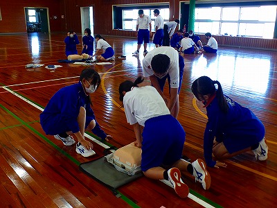6日(水)の3、4校時、2年生が保体の授業で、救命救急について取り組みました。保体科の先生と養護教諭の先生とのティームティーチングによるものです。宮崎市消防局(西部出張所)様より訓練用の人形やAEDをお借りしました。ありがとうございました。先生から心肺蘇生についての説明を受けた後、人形を使って実際に胸骨圧迫を行いました。続いて、AEDを使う訓練をしました。2年生は、17日(日)から修学旅行に行きます。緊急時への対応として、この学びは貴重な経験になることと思います。