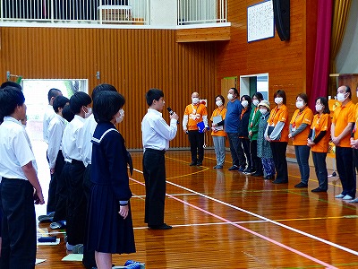 21日(木)の授業終了後に生徒集会を開きました。新しくなった生徒会役員が企画をして、交流会を行いました。まずは、学年や学級の枠をはなれてグループを作ります。その後は、自己紹介などを簡単にしました。あまり時間はとれませんでしたが、交流をきっかけにして挨拶などの輪が広がっていくことを目的とした新役員の皆さんの思いが伝わってくる生徒集会でした。役員の皆さん、ありがとうございました。また、いろんな企画を提案して実行に移してください。期待しています。