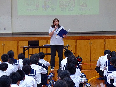 15日(金)の4校時、1年生を対象とした人権学習がありました。初めに、綾町在住の人権擁護委員の方々からの講話がありました。その後、SNS上で起きるいじめについてのDVDを視聴しました。最後は、教室に戻って、今日の学習の感想を書きました。この学習を通して、インターネット上のSNSトラブルを自分事として捉えることができたと思います。人権擁護委員の皆様、ありがとうございました。