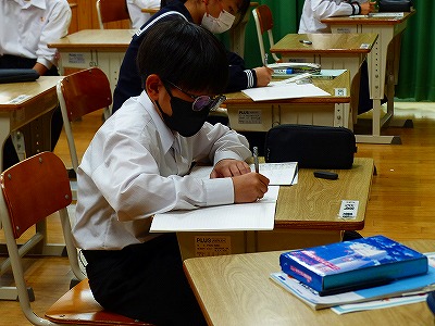 6日(水)の1校時、全学級で硬筆検定に取り組みました。学年によって出題内容は変わりますが、どの学年もある文章を文字の大きさや行の中心、字形などに気をつけ、楷書で書くものでした。また、俳句を行書で書いたり漢字の筆順を答えたりする問題もありました。どの学年ともに真剣な態度で集中して取り組めていました。