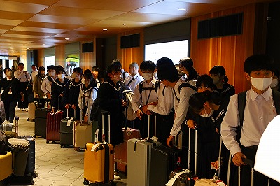 修学旅行の2日目がスタートしました。体調不良の生徒もいなく、みんな元気で起きてきました。今日は自主研修です。朝食前に確認を終わらせました。朝食を食べて、自主研修に向かいます。