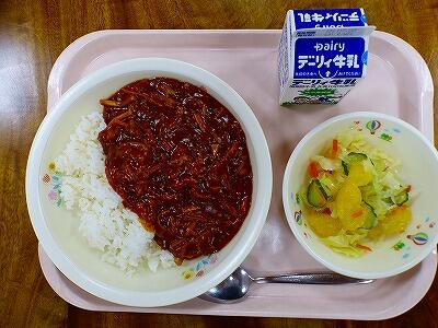 20日(金)の給食は、シャキッとハッシュドポーク(麦ご飯)、甘夏みかんサラダでした。ハッシュドポークには、綾ぶどう豚がたっぷりと使われています。カレー皿にのせて食べると、おいしさも引き立ちます。おいしくいただきました。給食に関わっていただいているすべての皆様に感謝します。いつもありがとうございます。