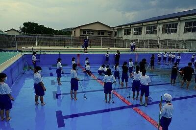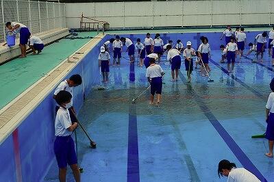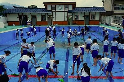25日(水)の体育の時間を使って、プール清掃を行いました。1年間使用していなかったため、底には落ち葉や泥などがたまり、掃除は想像以上に大変でしたが、生徒たちは協力しながら根気強く取り組みました。ブラシで磨き、水で流し、最後には見違えるようにきれいになりました。7月から始まる水泳の授業に、安心して取り組むことができます。
