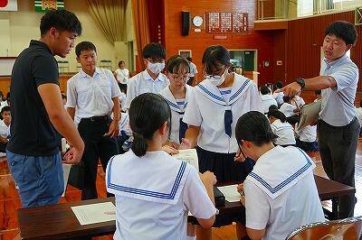 22日(月)の放課後、綾マラソンに向けて、生徒会役員が地域の方々を対象にした企画説明会を行いました。綾中生が考えたのは、給水スポットで綾の新鮮な野菜や果物をランナーに提供することです。農家の方々の協力が不可欠であることを伝えると、参加者の方々から様々な助言をいただきました。なかには「パイナップルを出せる」との心強いお話もありました。いただいた意見を参考にしながら、地域の力とともに大会当日に実現できるよう準備を進めていきます。参加をしていただいた方々に感謝します。ありがとうございました。
