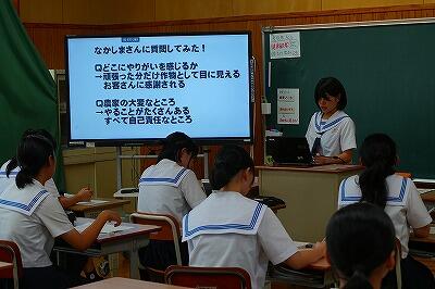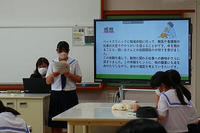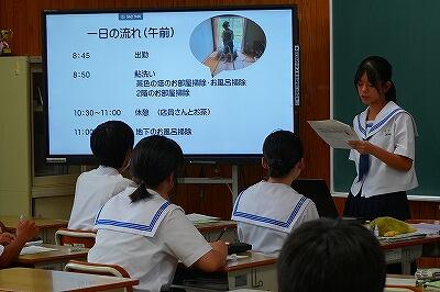 25日(木)は参観日でした。今回は、2・3年生が綾人体験学習(職場体験学習)の成果をプレゼン形式で発表しました。生徒たちは、自らの体験を丁寧にまとめ、学んだことや気づきを分かりやすく伝えていました。聞く側の生徒もメモを取りながら真剣に耳を傾け、互いの学びを共有する姿が印象的でした。保護者の皆様も熱心に発表を聞き、生徒の成長を実感されたことと思います。体験を言葉にし、他者に伝えることを通して、学びが一層深まったことと思います。来校していただいた保護者の皆様、ありがとうございました。