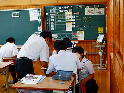 6月がスタートしました。3日(月)、1校時の授業の様子です。2年生の数学の授業では、問題に真剣に取り組んでいました。生徒同士での確認や、教師による個別対応も見られ、学習内容の確実な定着を目指します。
