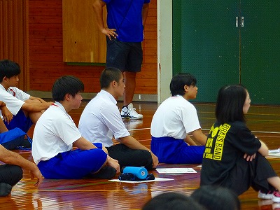 夏休みに入り、連日猛暑が続いています。そのような中、部活動生と職員による救命措置に関する研修会を、24日(水)の午前中に行いました。初めに、熱中症防止への対応について養護教諭の先生から話がありました。その後、心肺蘇生法としての胸骨圧迫や、AEDの使い方などを体験しました。本来ならば、消防署の方を講師としてお願いしていたところでしたが、救急事案対応のため本校職員が講師を務めました。暑い体育館の中での研修でしたが、生徒たちは真剣に取り組めていました。新たな知識も学べたことと思います。講師を務めた保健体育部の先生方、ありがとうございました。