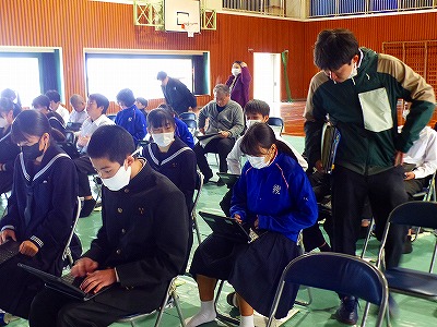 6日(金)の午後、新入生説明会が開かれました。説明会の前に、全学級の授業の様子を生徒会役員の引率のもと、見学しました。時間は限られていましたが、中学校での授業の雰囲気がつかめたことと思います。見学後は、生徒会役員が中学校の様子について動画をなどを使いながら説明しました。また、担当の先生からの話もありました。説明会終了後は部活動を見学しました。生徒会役員の皆さん、ありがとうございました。6年生の児童の皆さん、4月の入学を楽しみに待っています。