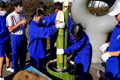 19日(木)の午後、2年生が門松づくりに取り組みました。学校用務員の先生や教育委員会の先生方のご指導のもと、竹を切り、飾り付けを行いながら、伝統文化に触れる貴重な体験となりました。指導者の方からは、門松の由来についてもお話がありました。門松は、年神様を家に迎えるための目印であり、松は「永遠の生命力」、竹は「成長と繁栄」を象徴しています。この伝統には、新年を迎える喜びと、家族の健康や幸せを願う思いが込められています。生徒たちが心を込めて作り上げた門松は、学校の正門と、綾町文化ホール前に飾られ、来たる2025年が素晴らしい年になるよう願いを込めています。日本の伝統を未来へつなぐ素晴らしい活動となりました。ご指導いただいた皆様方に感謝申し上げます。ありがとうございました。