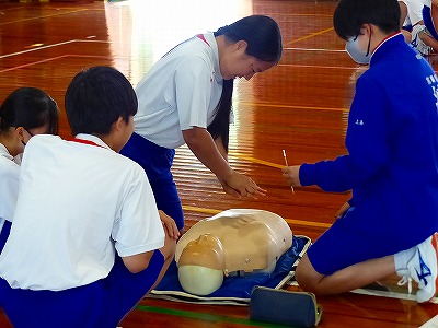 6日(水)の3、4校時、2年生が保体の授業で、救命救急について取り組みました。保体科の先生と養護教諭の先生とのティームティーチングによるものです。宮崎市消防局(西部出張所)様より訓練用の人形やAEDをお借りしました。ありがとうございました。先生から心肺蘇生についての説明を受けた後、人形を使って実際に胸骨圧迫を行いました。続いて、AEDを使う訓練をしました。2年生は、17日(日)から修学旅行に行きます。緊急時への対応として、この学びは貴重な経験になることと思います。