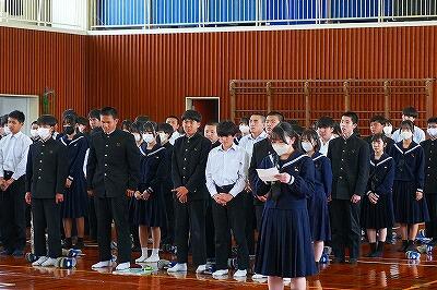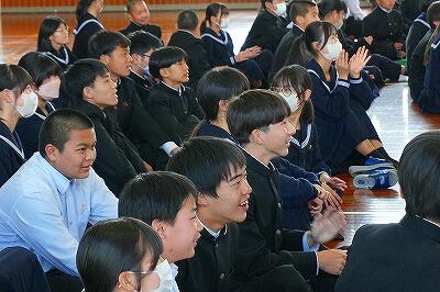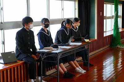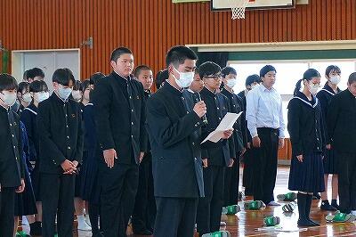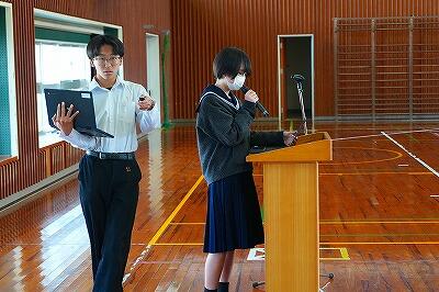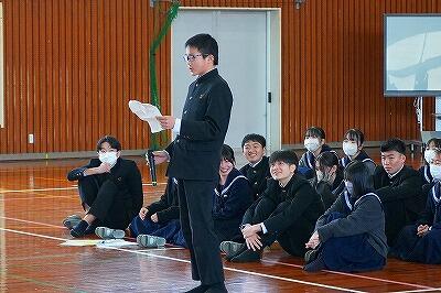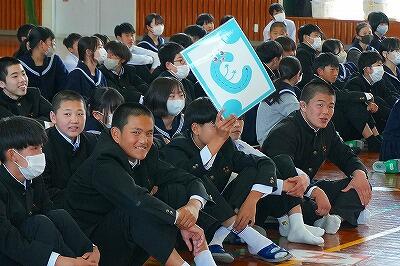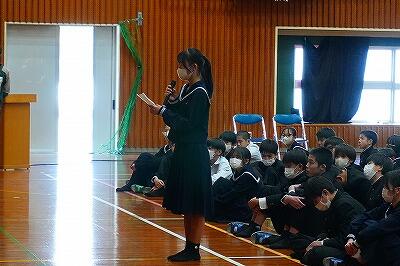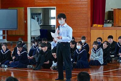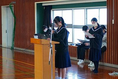 6日(金)、「感謝集会・交流給食」を行いました。今年度、生徒たちは「綾町のために、自分たちにできることは何か」を考え、さまざまな活動に取り組んできました。その学びや実践を支えてくださった地域の方々をお招きし、感謝の気持ちをお伝えする場として開いたものです。これまで、生徒たちは講話を通して地域の魅力や役割について学びました。また、綾マラソンでは地元の農産物を寄贈していただき、ランナーの皆さんに届ける企画を行いました。さらに、学校給食では綾の食材を定期的に使わせていただき、ふるさと綾の恵みを日々感じながら生活しています。集会では、各学年がそれぞれの言葉で感謝の思いを伝えました。合唱では歌詞を工夫し、地域への感謝が届くよう心を込めて歌いました。また、感謝のメッセージや感謝状をお渡しし、日頃の支えへの思いを形にしました。集会後には、地域の皆様と生徒が一緒に給食を囲む交流給食も行いました。言葉を交わしながら食事をすることで、感謝の気持ちはさらに深まり、温かな交流の時間となりました。地域と学校がここまで深く結びつき、ともに歩んできた今年の活動の意義はとても大きいものです。ふるさと綾を愛する気持ちを、地域の皆様と生徒たちが互いに共有できた、温かく幸せなひとときとなりました。参加をしていただいた皆様、ありがとうございました。また、当日の運営に関わった生徒の皆さんにも感謝します。準備等、ありがとうございました。ご指導していただいた先生方、ありがとうございました。