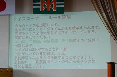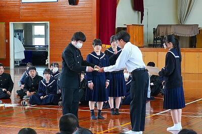 12日(木)、三年生を送る会が行われました。生徒会役員が中心となり、「中学校生活最後の思い出になる時間にしたい」という思いで、時間をかけて準備してきた企画です。学校生活や先生方などに関するクイズが出題され、会場は大いに盛り上がりました。クイズづくりのために、先生方へ事前にアンケートを取るなど、生徒会の工夫と努力が感じられました。また、三年生から後輩へ向けたアドバイスの言葉も語られました。実体験に基づく言葉は説得力があり、後輩の皆さんの心にしっかりと届いたことと思います。各学年からの感謝の言葉、三年生からのお礼の言葉が交わされ、会場には温かく優しい空気が広がりました。最後には、クイズ大会上位学級が表彰されました。「この学校で過ごせてよかった」、そんな思いを感じられる、心に残るひとときとなりました。生徒会役員の皆さん、そしてご指導くださった先生方に心から感謝いたします。ありがとうございました。