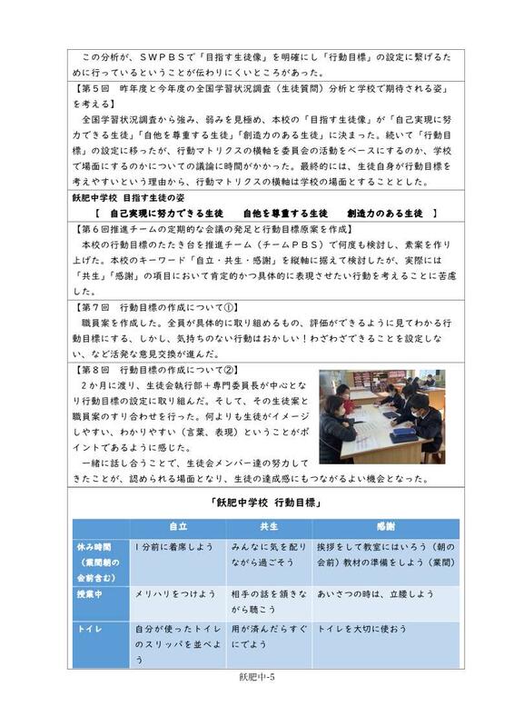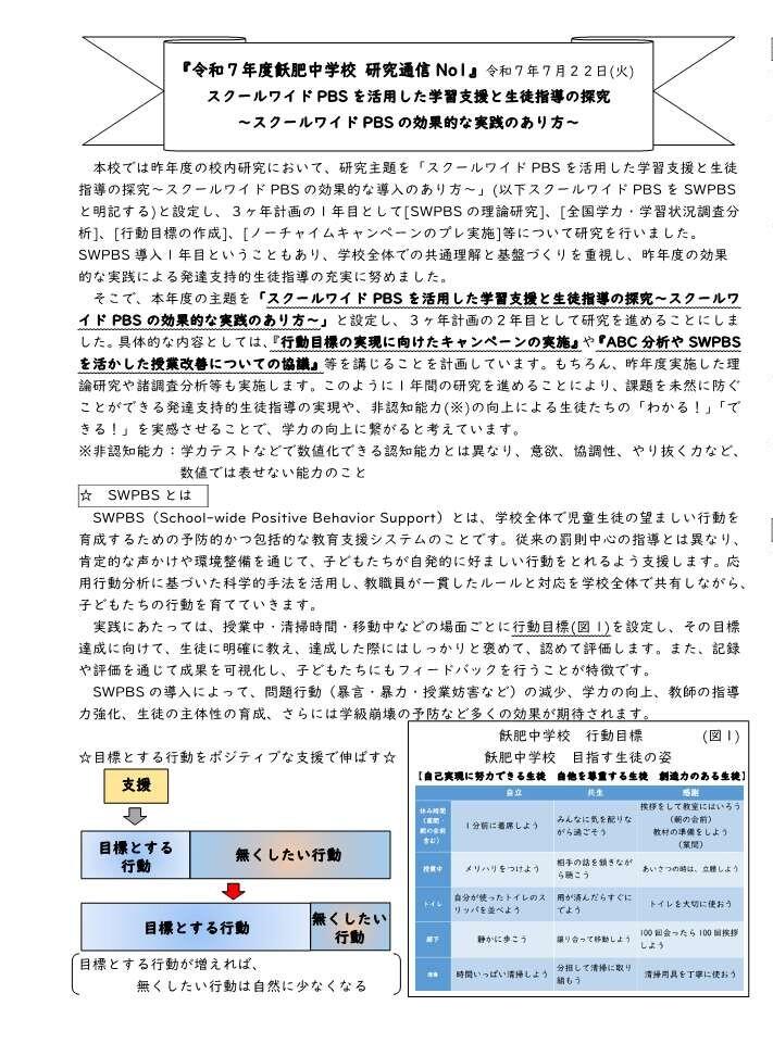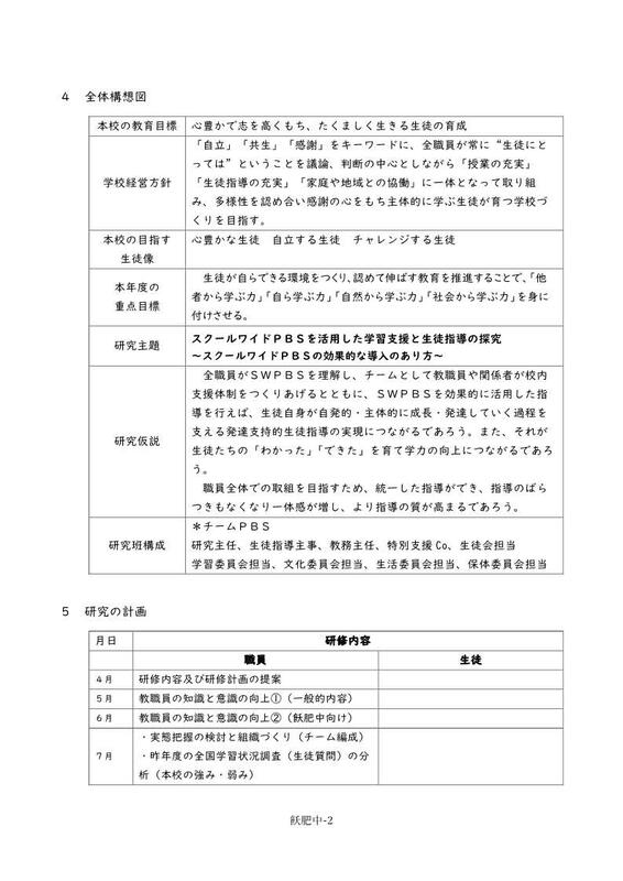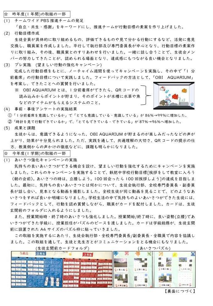 飫肥中学校では、スクールワイドPBSの実践をとおして、生徒の自己肯定感を高め、主体的に学びに向かう態度や意欲を育成することを重点目標として取り組んでいます。