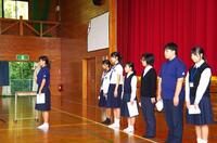 続いて新生徒会役員の認証式を行いました。執行部と専門委員会の役員一人一人に任命状が手渡され、最後に新生徒会長が代表してあいさつをしてくれました。その言葉や表情からやる気でいっぱいになっていることが伝わってきました。これから1年間、飫肥中学校生徒会の中心となって活躍してくれることでしょう。また、前生徒会役員がベースとなる行動目標を作ってくれた”スクールワイドPBS”を飫肥中生徒会の活動として根付かせてくれることも期待しています。