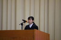 最後に生徒会を代表して﨑田創士くんが3学期の重点目標である”感謝”をテーマに「3年生に感謝の気持ちをもって送別行事に取り組もう」と呼びかけました。あわせて、毎朝掲揚している国旗をPTA事務の先生が修理してくれたことを紹介し「見えないところで支えてくださっている人に感謝の気持ちをもとう」と述べてくれました。