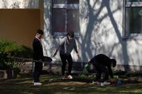 11月27日(木)、ふと中庭に目をやると3組の生徒と担任の先生が花壇に一生懸命花を植えてくれていました。夏の間はサツマイモを育てていた花壇で、収穫後はそのままになっていました。これからはきれいな花がみんなの心を和ませてくれるでしょう。ちなみに花は文字の形に植えられています。何と書かれているか分かりますか?