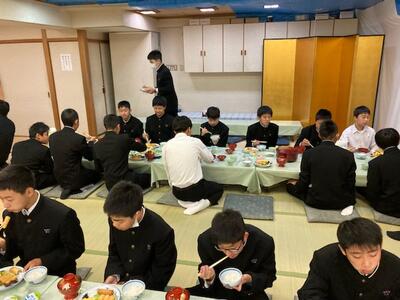 また、五百禩(いおし)神社は、飫肥藩主伊藤家の菩提寺である報恩寺が、明治5年の廃仏毀釈により、その跡地に建立されたものであるなど、飫肥の歴史を感じる一日でもありました。清掃後は飫肥公民館に移動して、カレーライスや飫肥天が振る舞われ、温かくおいしい食事をいただきました。そして、ボランティア活動後の疲れはありましたが、生徒たちは地域に貢献できた心地よい満足感を感じているようでした。