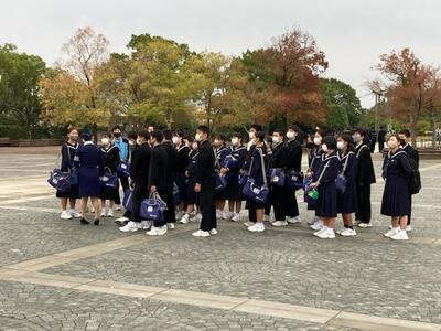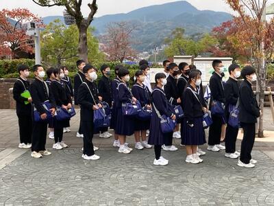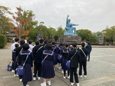 昨夜の雨が嘘のような晴天になり、早朝6時15分に予定通り出発しました。9時30分には、新八代駅で新幹線への乗車も練習の時と同様に手際よくできました。その後、広島の平和記念公園を訪れ、平和学習を行いました。生徒たちは原爆の悲惨な状況を見聞きし、戦争の恐ろしさについて深く学ぶことができました。それから全員で原爆の子の像を訪れ、心を込めて折った千羽鶴を捧げて、平和の誓いをたてました。
