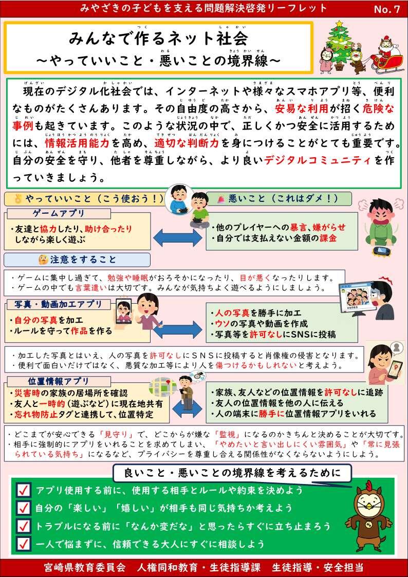 県教育委員会より啓発リーフレットが届きました。本校でも多くの生徒がインターネットを利用してゲームやSNSを行っています。使い続けているうちに、やっていいことと悪いことの境界線を越えてしまいそうになることもあると思います。そこで踏みとどまるためには、正しい知識と判断力に加えて、ご家族や地域の方々の関わりがとても大切になると考えています。このリーフレットをお子さんと一緒にご覧いただいて、関わりを強めていただけますとありがたいです。