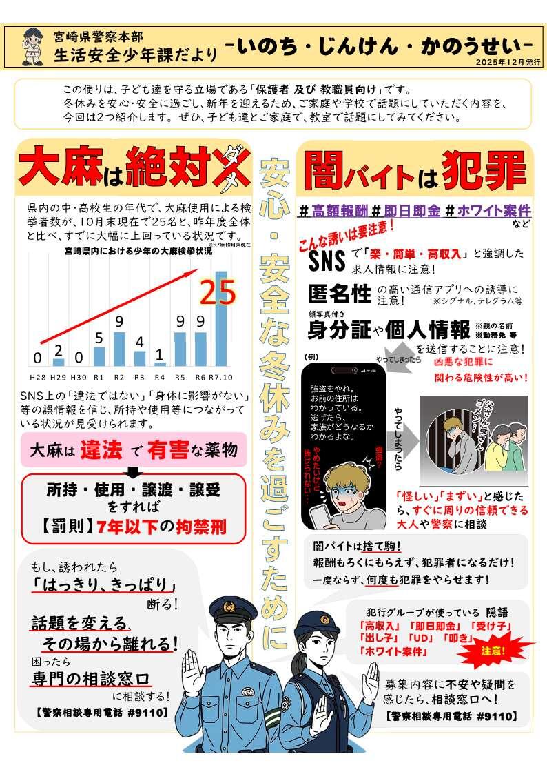 宮崎県警察本部生活安全少年課より、子どもたちが冬休みを安全に過ごすための啓発リーフレットが届きました。冬休みは子どもたちが自由に過ごす時間が多くなり、薬物や闇バイトなどのトラブルに巻き込まれる危険性も高まります。リーフレットをお読みいただいてご家庭や地域でも話題にしていただくことで、子どもたちを危険から遠ざけることができると思います。どうぞよろしくお願いします。