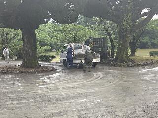 本日、雨の中、環境整備委員の方々が校門前に砂利を入れてくださいました。水たまりがなくなり、通りやすくなりました。ありがとうございました。