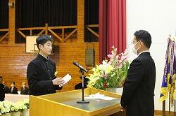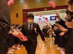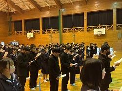 昨日は、第76回卒業式でした。日南市教育委員会、PTA、学校運営協議会から6名の来賓をお迎えして実施しました。久しぶりの全校生徒を入れての式典、久しぶりの校歌合唱・・・ようやく以前の当たり前に戻ってきた気がしました。とはいえ、卒業生以外は全員マスク。合唱時は卒業生もマスクでした。合唱ではマスク越しに感動の歌声を全校生徒が体育館に響かせてくれました。いい卒業式でした。