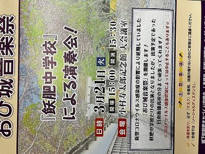 21日(火)に小村寿太郎記念館において、飫肥中学校吹奏楽部によるおび城音楽祭が実施されました。あいにくの雨でしたが、予想を上回る150人近くの方々が見に来て下さいました。実施後のアンケートには「素晴らしい!」「想像以上の演奏でした。」「聞いていてとても感動しました」「楽しく聞かせてもらいました」などたくさんの温かいメッセージをいただきました。とても幸せな時間でした。おびまちづくり協議会の皆様にも大変お世話になりました。素晴らしい演奏をありがとう!3年生も短い練習時間だったにもかかわらず、バッチリでした。