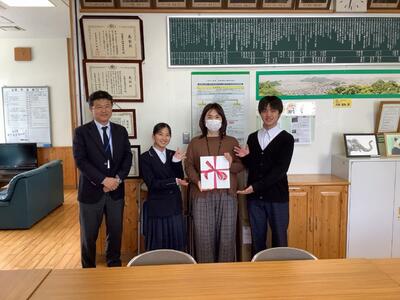 3月4日(水)、毎日の給食提供に携わっていただいている、栄養教諭の宮田先生をお招きし、校長室にて感謝の会を開きました。会では、全校保体給食委員長の河野瑛音さん、副委員長の鈴木椛乃さんの二人が全校を代表して、お礼の言葉を述べました。「いつもおいしい給食をありがとうござます」という言葉と一緒に、全校生徒の感謝の言葉を綴った色紙を宮田先生にお渡ししました。