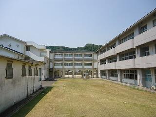 ⑩ グラウンドから見た体育館(左側)および教室棟全景