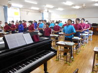 途中、本校生徒職員とのセッションでは、響座の岩切さんより代表が選出され、即興で演奏の練習を行い会場を盛り上げます。