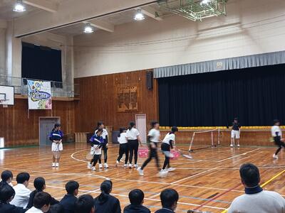 続いて全校じゃんけん列車です。勝った人の後ろに負けた人がつながり、むかでのように連なっていきます。本校の職員も参加し、このレクリエーションも大盛り上がりしました。