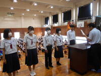 7月14日、県中学校総合体育大会選手推戴式が行われました。女子バスケットボール部、男子ソフトテニス部、水泳の三競技が県大会に出場。その大会での活躍に向けての推戴式です。
