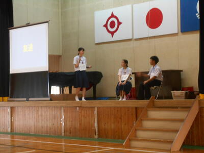 今回の集会の主題は、「あいさつ」です。あいさつの状況を改善していくために、生徒会が実演をして、生徒への働きかけを行いました。全学年でしっかりしたあいさつに取り組んでいくことをシミュレーションをしながら、呼びかけを行いました。