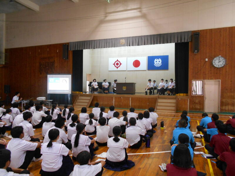 校長先生の話では、油津中の一員としてどうあるべきか、自分の言動を考える3つのものさしが提示されました。