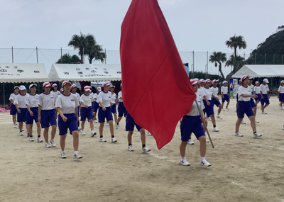 団色を決める競技のあと、赤団と青団が決定し、団長に団旗が校長先生より手渡されました。