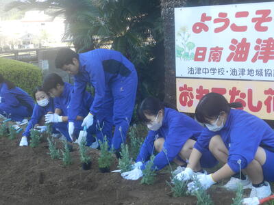 7月8日、地域ボランティア活動として、おもてなし花壇の植栽に本校生徒が参加をしました。