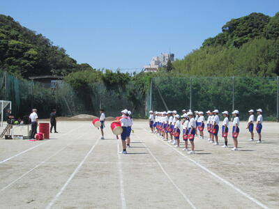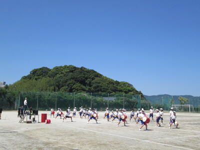 しばらく練習の様子を見学していましたが、聞こえてくる波の音、運動場に響き渡る太鼓の音がとても心地よく、本番での発表がとても楽しみになる練習風景でした。本番も今日のような青空の下で体育大会が実施できますように。