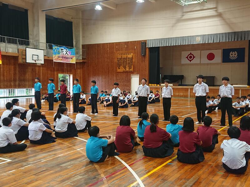 集会の一つの柱として、東郷小中学校児童生徒会が取組んでいる「届けよう服のチカラプロジェクト」と連携し、本校でも古着を回収し協力していくことが、生徒会から提案がありました。