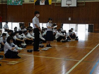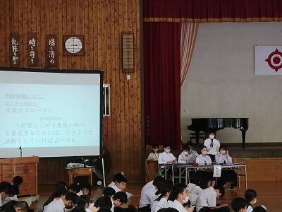 4月から各学級で協議を重ね、全体討議では「スローガンを達成するためにどのような活動を行えばよいか」について、積極的に意見が交換され、充実した討議となりました。