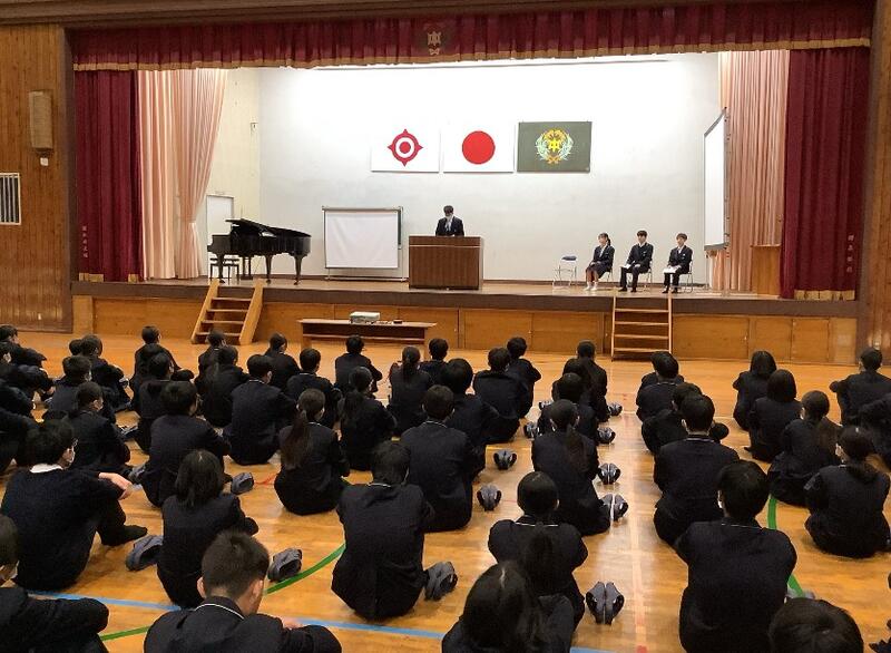 はじめに、各学年の代表生徒と生徒会代表、あわせて4名が2学期の生活や学習、行事を振り返り、それぞれの反省や成長、3学期に向けた決意を発表しました。どの発表からも、自分自身を見つめ直し、次につなげようとする前向きな思いが感じられました。